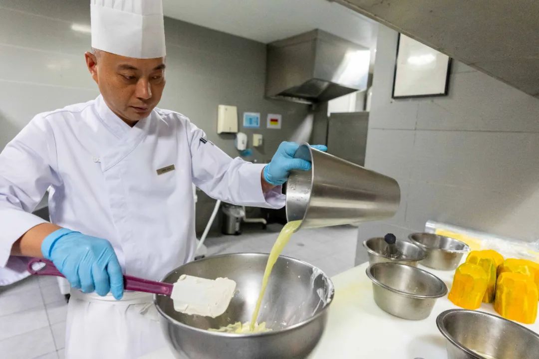“我们选用的是城桥镇聚训村产的甜芦粟。蛋糕里面有鲜榨的甜芦粟汁、加上奶油芝士和鸡蛋等。”厨师长高家民告诉记者,虽然自己不是本地人,但一直听说崇明的甜芦粟特别好吃,他就想着把甜芦粟做进甜品里,既能推广崇明本地的食材,又能给酒店增加特色甜品种类。