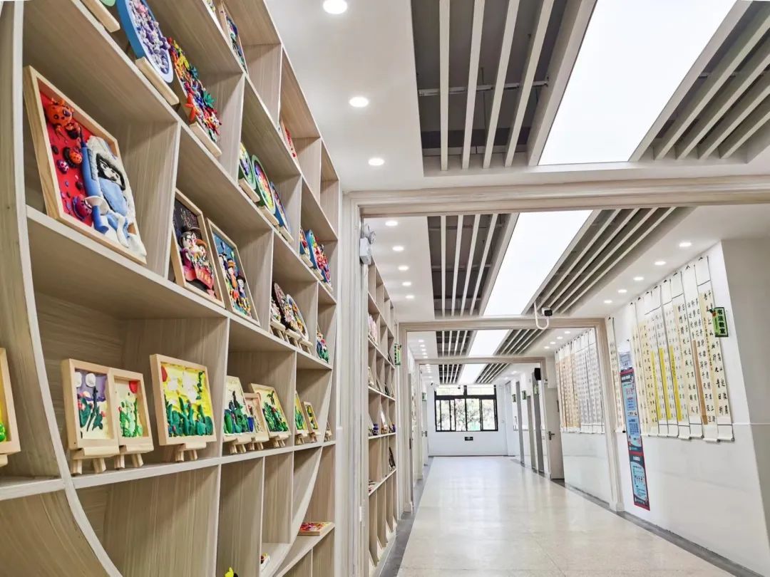 除了精巧的读书吧,专用教室外的墙面也颇为亮眼。原本普通的墙面被设计成了艺术作品展示区。学校“指尖精灵”彩泥创新实验室指导教师姚梦蝶介绍,展示区的展品根据教室功能个性化设置。“书法教室外展示书法作品,彩泥教室外展示彩泥作品。”姚梦蝶说,展品每隔一段时间更换一次,每名学生的作品都有机会得到展示。这样的艺术作品展示活动也增添了学生们艺术创作的热情和信心。“每次路过走廊看到自己的书法作品,都感到很自豪。”四(5)班学生王婧涵表示。五(2)班学生任相禾也常指着一件装裱精致的泥塑作品向大家介绍自己的得意之作。