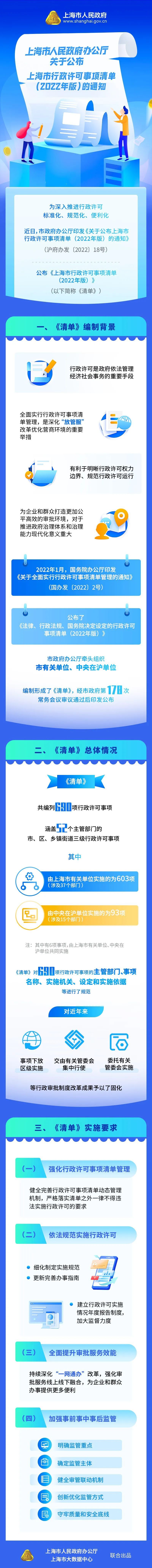 上海市人民政府印发《公布上海市行政许可事项清单(2022年版)的通知》。《清单》共编列690项行政许可事项,涵盖52个主管部门行政许可事项,对行政许可事项的主管部门、事项名称、实施机关、设定和实施依据等进行了规范。详见↓