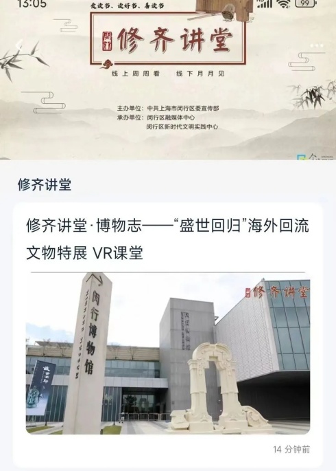 据了解,今年区委宣传部联合闵行博物馆,举办“修齐讲堂·博物志”系列活动,通过沉浸式的讲座,以线上VR导览、线下实地观展、交流观后感的形式,让修齐讲堂成为市民们见证历史、增长知识、陶冶情操、提升境界的生动课堂。