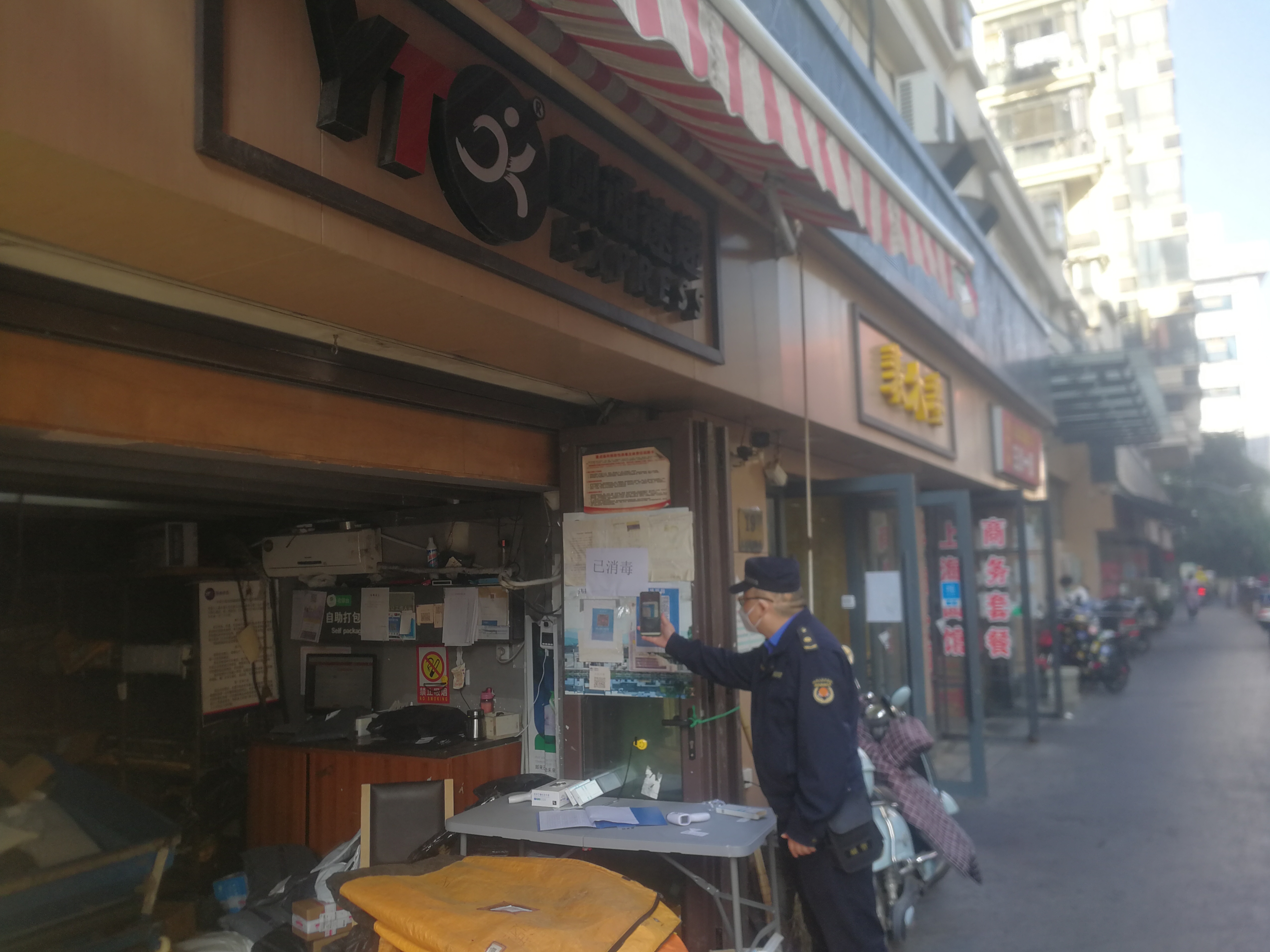 近一个月,执法队员坚持每天对辖区快递物流站点内的从业人员24小时核酸码、有无佩戴口罩、测温记录、场所消杀记录、“场所码”扫码情况等进行监督检查,发现问题及时进行纠正并警告。