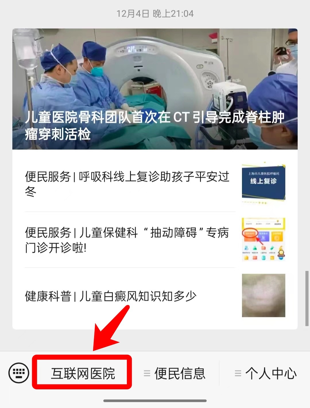 扫码关注【上海市儿童医院互联网医院】微信公众号,点击“互联网医院”。