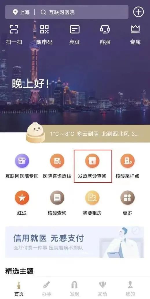 1.打开“随申办”微信小程序、“随申办”APP、“随申办”支付宝小程序,首页搜索“发热就诊查询”,或点击首页运营位进入。