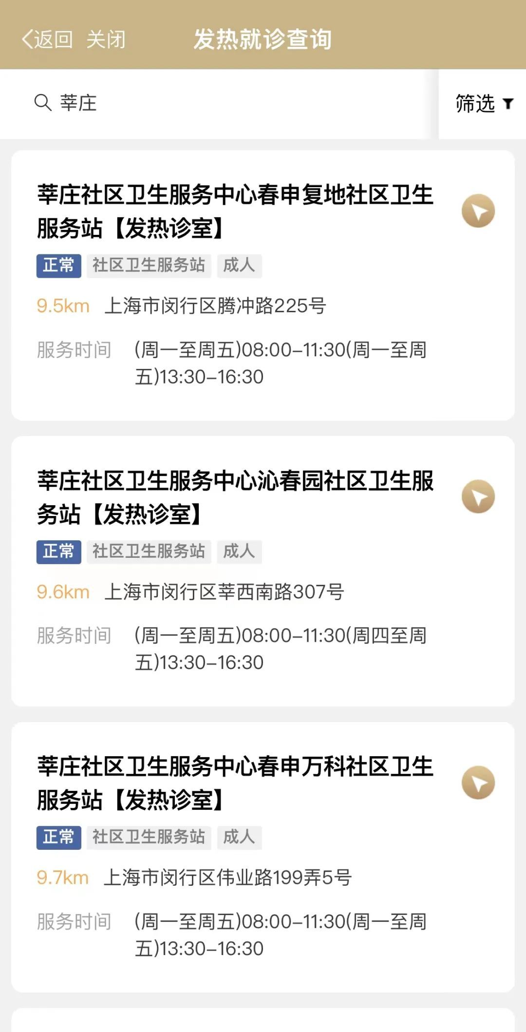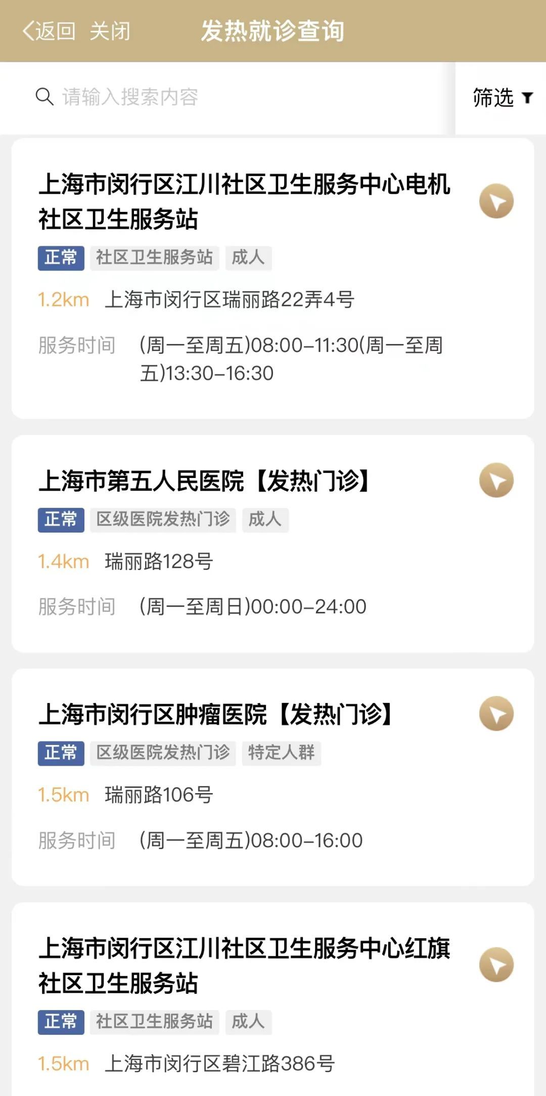 2.页面展示发热就诊点位名称及地址、点位距离、忙闲状态、服务时间等信息。