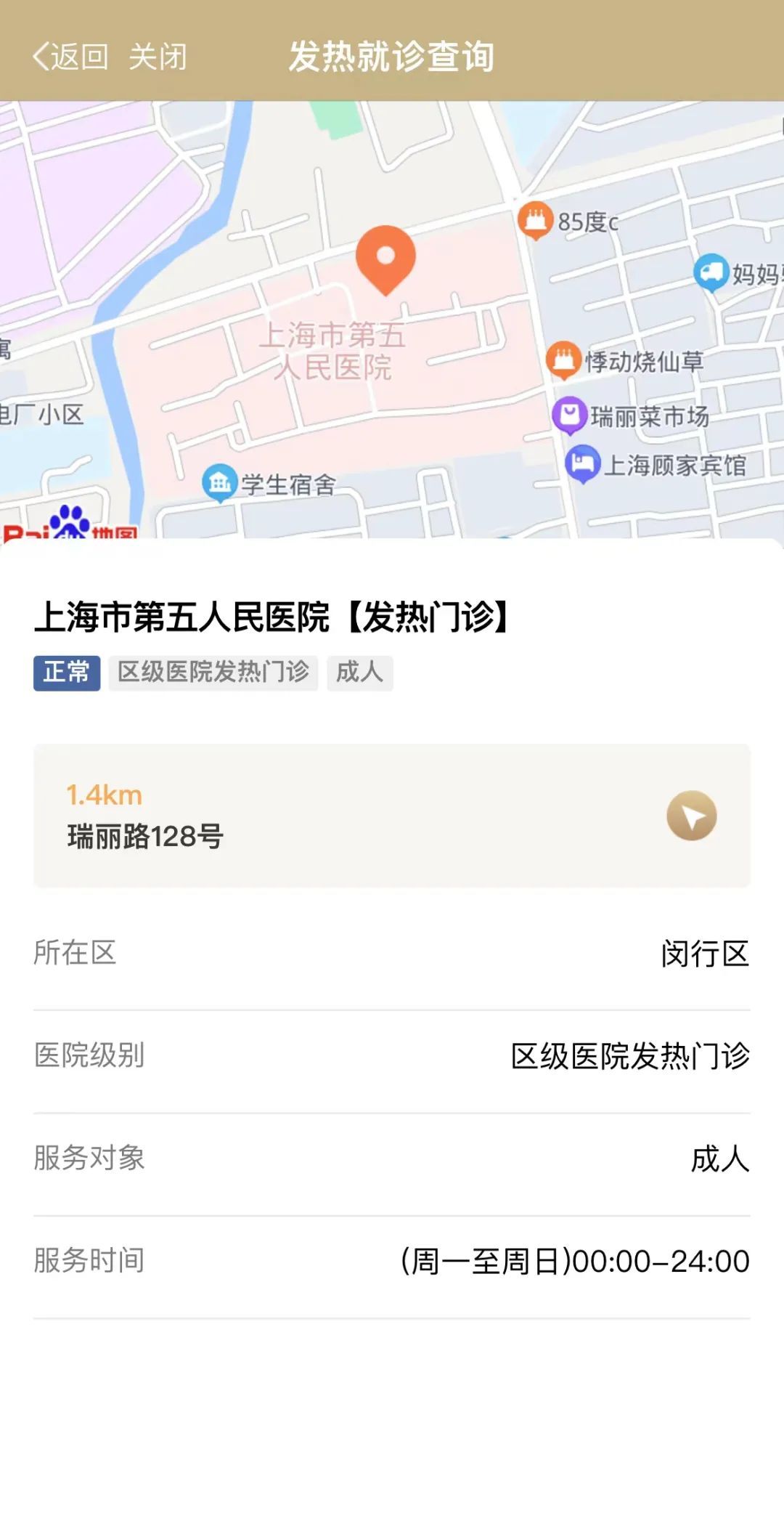 4.选择相应的发热就诊点位进入,可点击右方导航的图标,打开对应地图软件,可进行电子地图导航直达发热就诊点位。