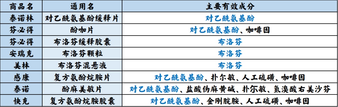 西药有一个概念很容易混淆,就是药品的商品名与通用名,我们常说的999感冒灵、泰诺、快克都是商品名,是各个企业给他们生产的药品制定的一个标签,它们的通用名分别为感冒灵颗粒、酚麻美敏片/混悬液、复方氨酚烷胺胶囊,而这些药物中都有一种相同的能够帮助退热的成分-对乙酰氨基酚。