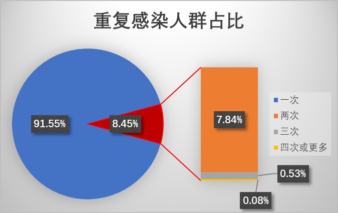 根据英国政府报告[1]统计,2020年7月至 2022年11月期间有 6.75% 的感染者发生了重复感染,重复感染者中93.4% 发生在奥密克戎流行期间。