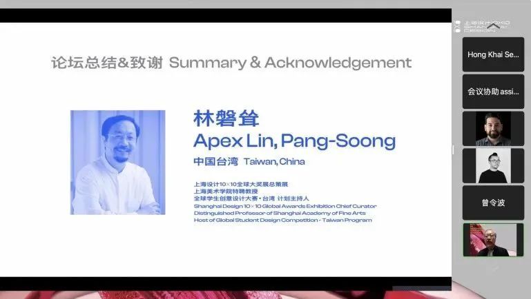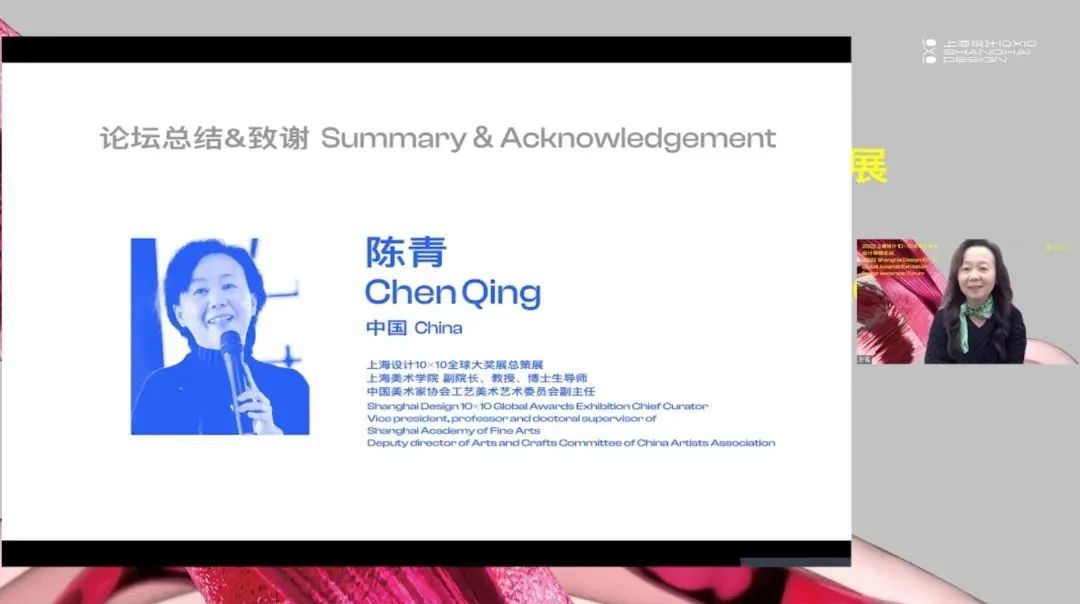 陈青教授最后再次感谢各位世界大奖的领袖和代表们为2022“上海设计10×10”全球大奖展推选的精彩作品,让2022年的寒冬充满了明媚与温暖。并总结到,论坛展现了全球各地不同文化之差异与全球设计之大同。