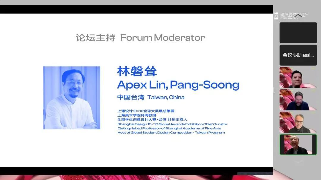 此次论坛由两位“上海设计10×10”总策划,即上海美术学院副院长陈青教授和上海美术学院特聘教授林磐耸先生联合主持。陈青教授首先介绍了此次2022“上海设计10×10”全球大奖展的展览情况,此次展览于2022年12月16日在中华艺术宫0米层B1展厅隆重开幕,由上海美术学院和中华艺术宫(上海美术馆)共同主办。展出了10个全球顶级的世界设计大奖组织推选的共计一百余件全球最前沿的先锋设计作品,向国内外传播了“上海设计”这一极具特色的中国当代设计文化交流品牌。展品涵盖了海报设计、室内设计、产品设计、体验设计、建筑设计、包装设计、品牌形象设计等多个类别,全方位促进“上海设计”与全球设计的专业对话。
