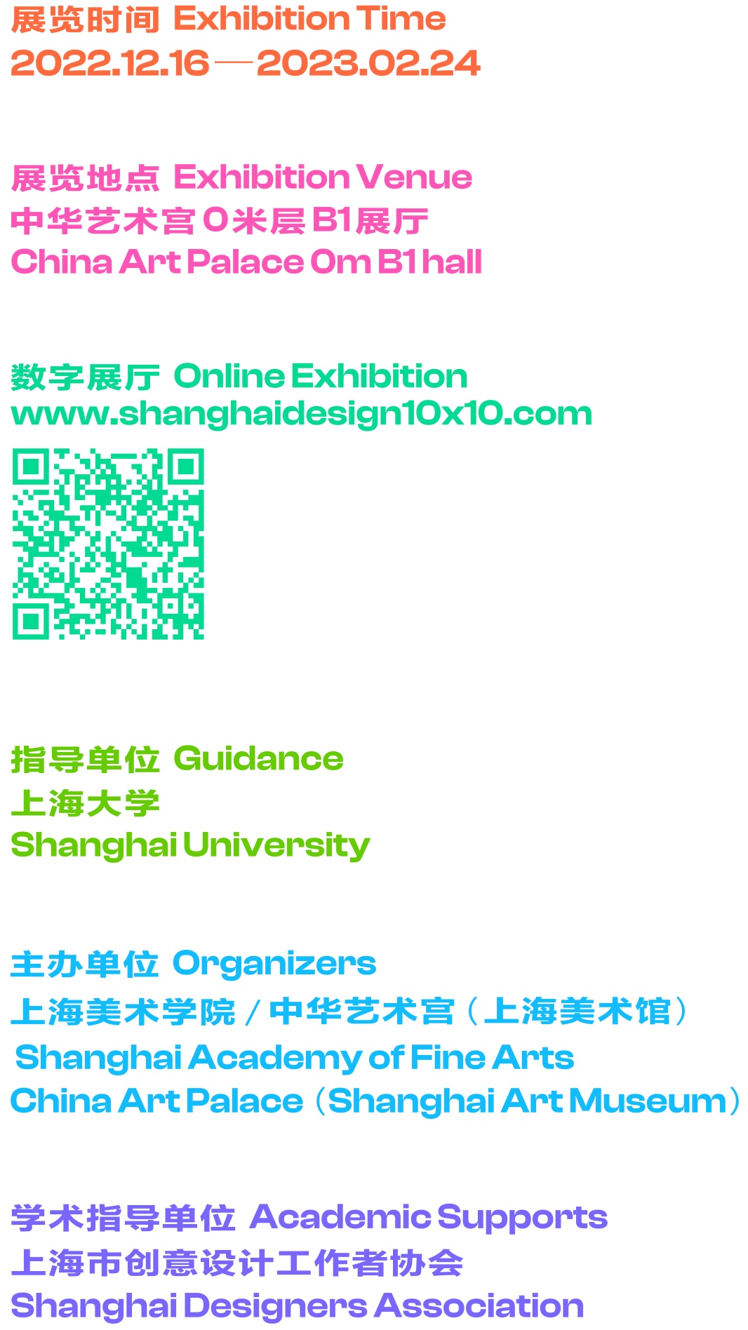 “上海设计10×10”是在“上海设计”概念上延伸出的展览与交流项目,也是上海美术学院与中华艺术宫(上海美术馆)文教结合、馆学合作的重要学术品牌。旨在打造“上海设计”全球合作交流的高端平台,以交流机制促进设计创新,提升上海城市文化发展的全球影响力,演绎中国式现代化都市设计的文化实践内涵与胸怀,彰显上海国际文化大都市的神韵与魅力。
