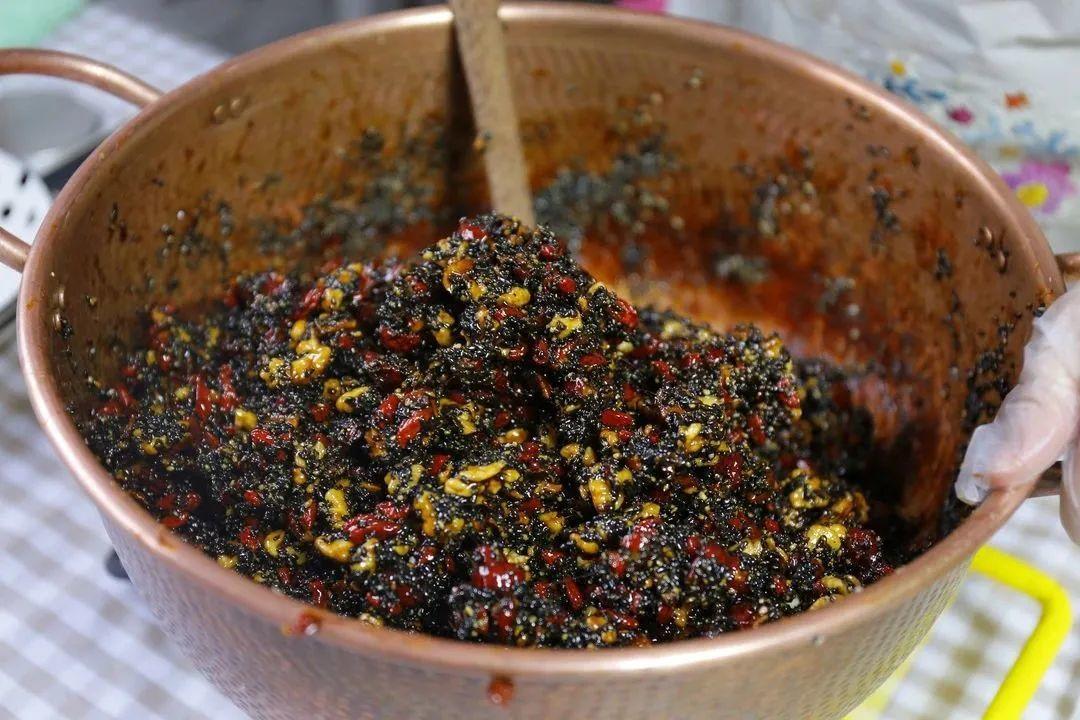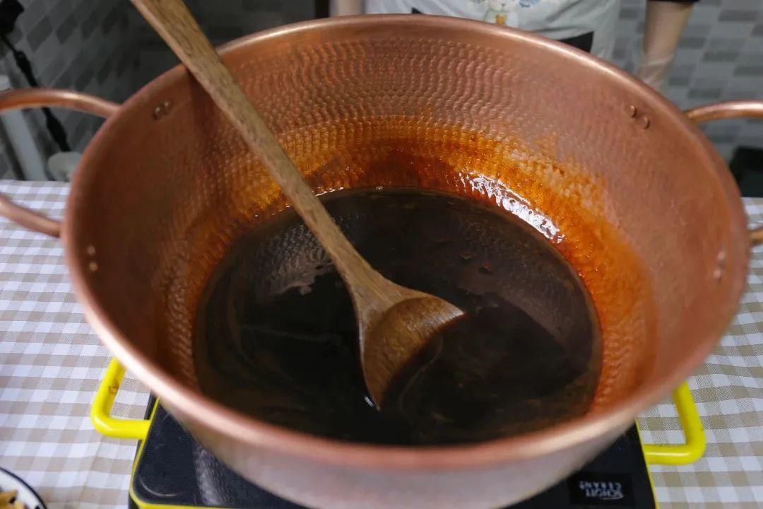 事先将阿胶倒入锅中,倒入黄酒搅拌均匀,浸泡到阿胶完全化开,就可以进行熬制。大火熬至开锅,立刻转小火慢熬。在熬制过程中一定要用勺子不断地搅拌以免粘锅。熬制至挂旗,这一步对于阿胶糕的制作时尤为重要的,这关系到黄酒有没有充分的挥发,这一步做不好很容易导致做出来的阿胶糕松软。