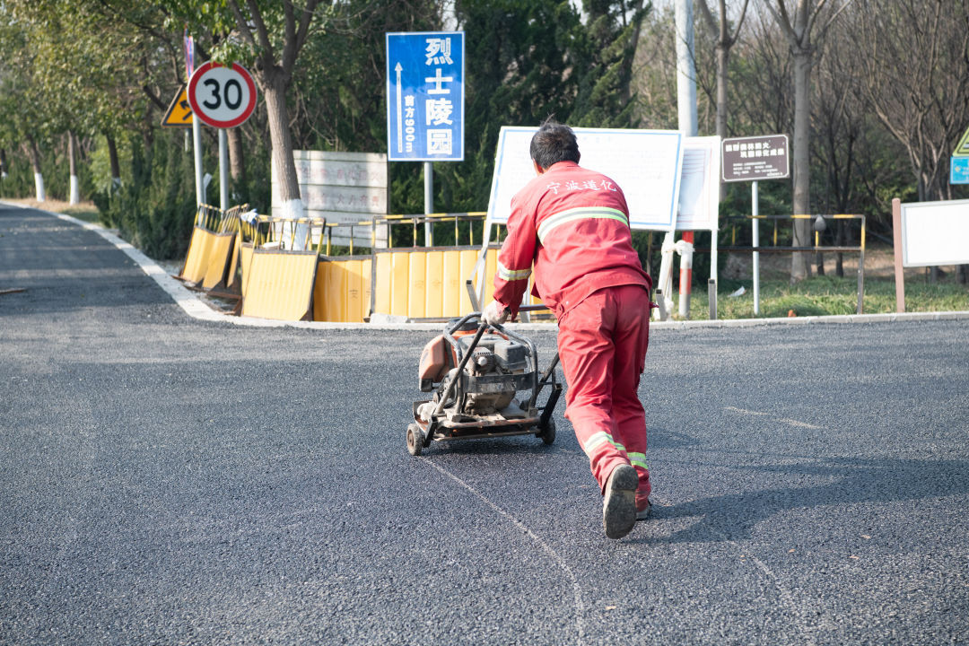 在东海陵园路的施工现场,工人们正在抓紧时间铺设沥青。沥青铺设完毕后,东海陵园路就将正式改造完成。
