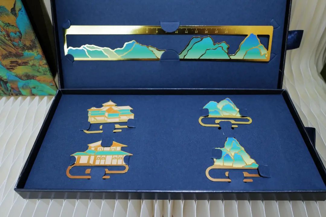 直到今日,《千里江山图》被深藏于故宫博物院,每一次的亮相,都会引发盛况空前的热闹。为解更多没能一睹真迹的观众的遗憾,故宫文具特意推出了“千里江山望无垠手帐套装”,将山水元素注入到了文具产品设计当中。封面印有乾隆皇帝御笔所书“江山千里望无垠”的笔记本,将北宋经典艺术、审美与现代世俗生活巧妙连接起来,小小一本内含乾坤。