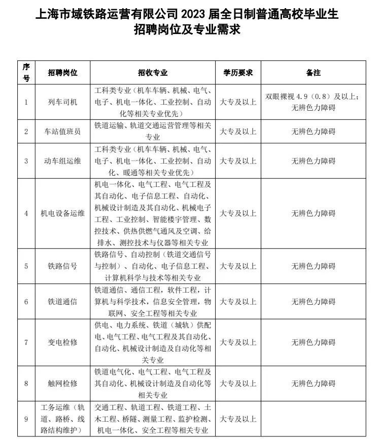 据申通地铁集团消息,上海市域铁路运营有限公司招聘2023年全日制大专(高职)及以上学历应届毕业生。应聘者前往上海地铁官网www.shmetro.com(点击“阅读原文”即可)招聘信息专栏,下载并填写《上海市域铁路运营有限公司应届生应聘报名登记表》,于3月31日前将应聘登记表(电子版)发送至shsyzp@126.com邮箱。招聘岗位、专业及学历要求等详见↓