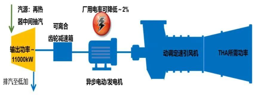 本工程采用的“汽电双驱”引风机技术已在国家能源集团宿迁电厂、华能金陵电厂中得以运用,实际运行效果良好。利用该节能新技术,配套背压式小机,利用小机驱动引风机及异步电机,并将小机排汽回热或对外供热,可实现以下设备工况: