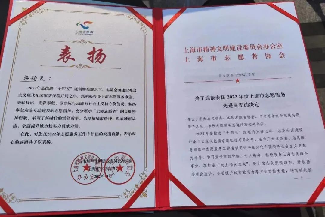 大学期间,他热衷公益、传递温暖,积极参加各种志愿活动项目;疫情发生以后,他勇担责任、逆行而上,积极投身于核酸检测一线;在2022年度上海市志愿服务先进典型宣传推选活动中,他脱颖而出,荣获2022年度上海市优秀志愿者称号......他就是宜川路街道中远两湾城第三居民区“第二梯队”成员梁钧天。