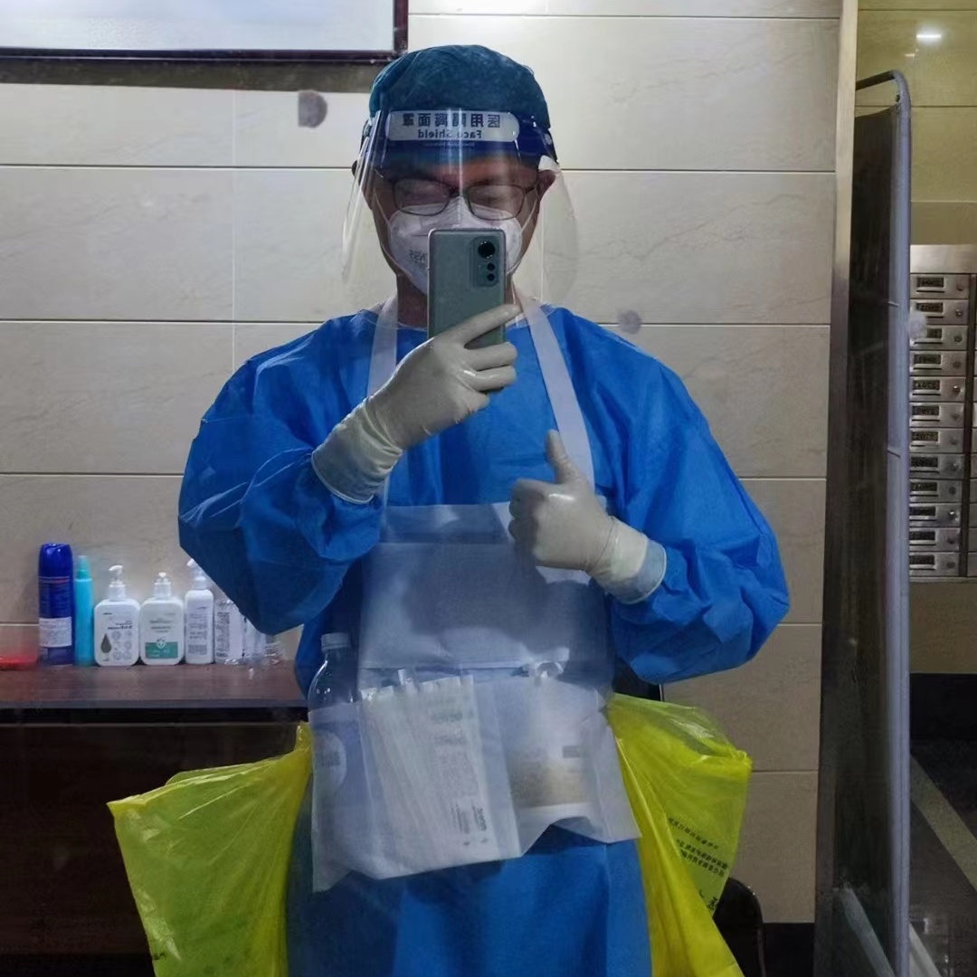 当社区大筛遇上高温“烤”验时,梁钧天再次挺身而出,和居委干部一起为行动不便的老人及居民上门做核酸。四十多名行动不便的老人分布在中远第三社区的29幢楼栋,梁钧天穿着双层防护服,带着面罩口罩,一趟跑下来衣衫已被汗水全部浸湿,累到连说话的力气也没有,但他却没有一丝抱怨,结束后默默回去,需要时又再次站出来。