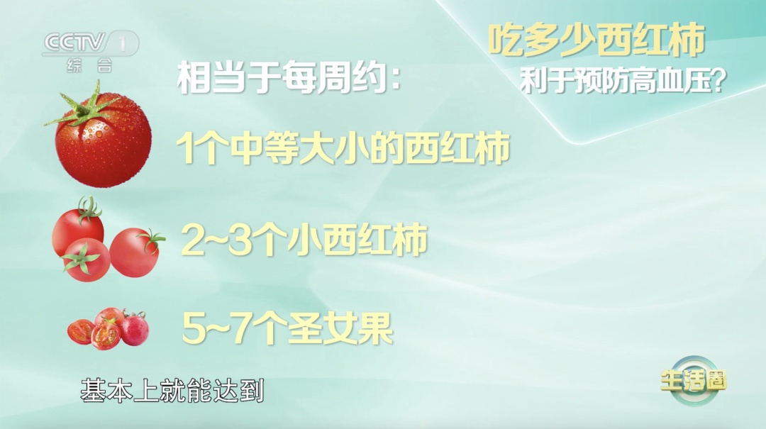 每个成年人每个星期摄入1个市面上中等大小西红柿,或者吃2~3个小一点的西红柿,也可以每个星期吃5~7个圣女果,基本上就能达到所推荐的摄入量。