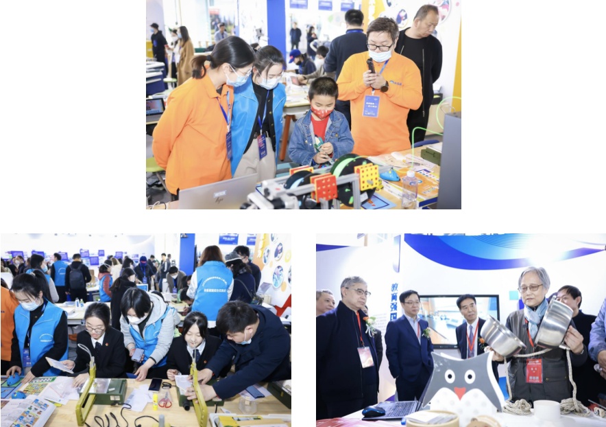 本次博览会特别设置了多个特色主题展示区,打造多样化的教育装备展示空间,综合呈现教育装备文化底色及融合运用的案例场景。在百年教育装备及装备赋能综合实践活动主题区,展示了上海教育装备的百年发展历程,还原了历史教育教学场景,彰显了教育装备的历史底蕴、社会价值;展区同时提供了综合实践教学案例,展示教学实践形式与内容等,还原真实教学应用场景,凸显“装备育人”阶段成果。值得一提的是,入选感动中国2022年度人物、被誉为“不刷题的吴姥姥”的同济大学退休教授吴於人和她的不刷题俱乐部团队在展区为现场的观众进行“不刷题做研究”展示,用她们带来的自制教具开展科学探究活动,深刻诠释装备赋能科学教育的生动实践。