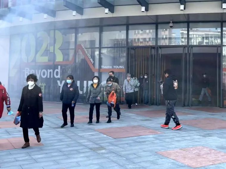 “各位请注意!现突发紧急情况,请大家保持镇定,安全有序撤离!”上午10点30分,YOUNG剧场区域内感烟探测器感应到燃烧产生大量烟雾后立即报警,火警楼层显示器和消控中心同时接到火警报警信号,演练正式开始。