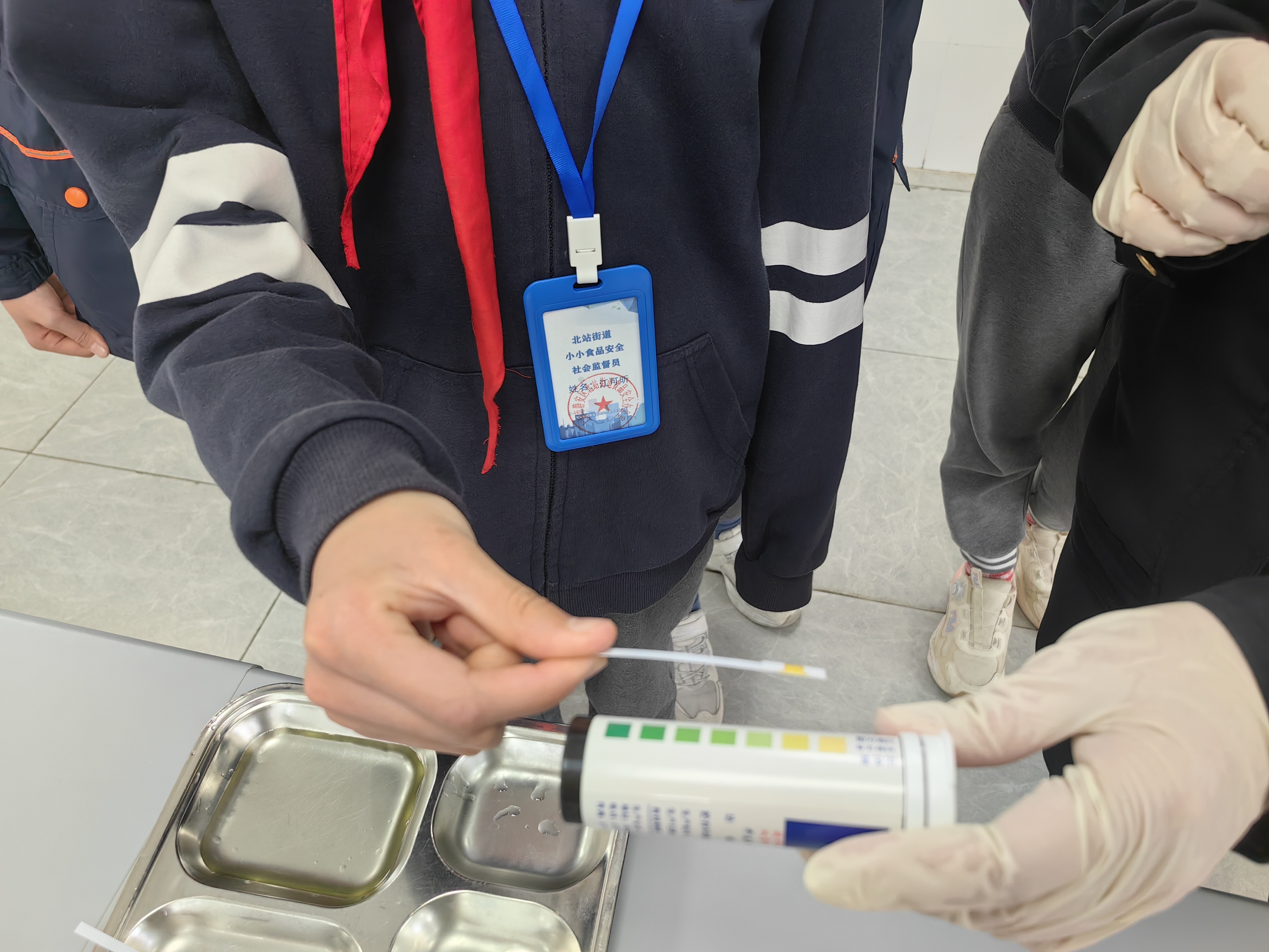 同时,通过手持式ATP荧光检测仪器、食用油酸价和过氧化值测试纸、碘盐、农残快检试剂盒,分别对学生们的餐盘、食用油、食用盐、绿叶蔬菜快速检测,短短几分钟后显示,检测项目均合格。
