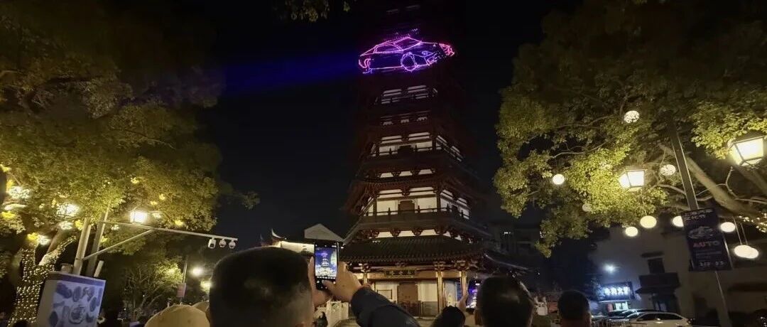 千年古塔光影流转,安亭老街上演“车影极光”激光秀
