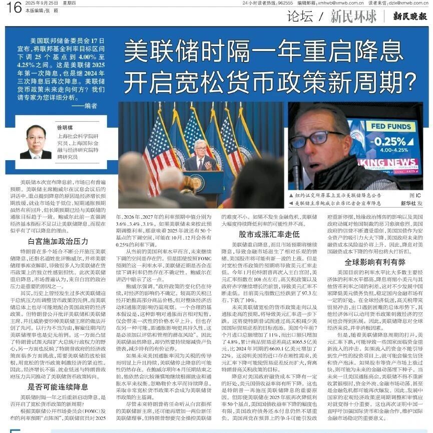 【智库声音】新民晚报 | 徐明棋:美联储时隔一年重启降息 开启宽松货币政策新周期?