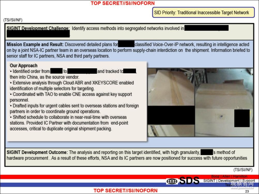无独有偶,2019年,格林沃德创办的新闻调查网站The Intercept进一步曝料,加密文件甚至给出了TAO“劫镖教程”。文件以运往中国的一笔物流订单为例,详细描述了对其进行定位、追踪、拦截、植入的全过程。