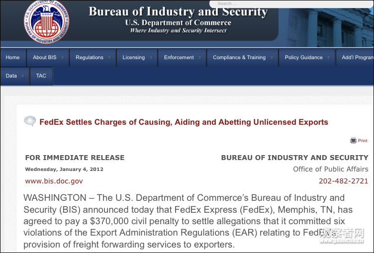 而在2012年1月,联邦快递就曾因6起违反《出口管制条例》的案例,被美国政府起诉。其中就包括2005年,联邦快递因向北京航空航天大学提供服务,包裹中含“未授权出口产品”,而“违反相关条例”,引起美国商务部关注。最终6起案件双方均达成和解,联邦快递愿意支付37万美元的惩罚。