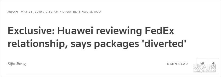 华为于上周五向路透社曝料,称其有包裹委托美国物流公司联邦快递(FedEx)寄送,却在未被通知的情况下被转运至美国。