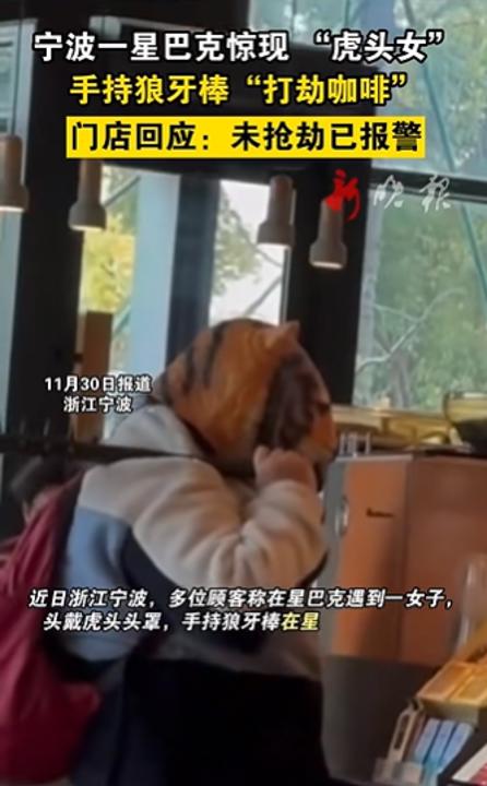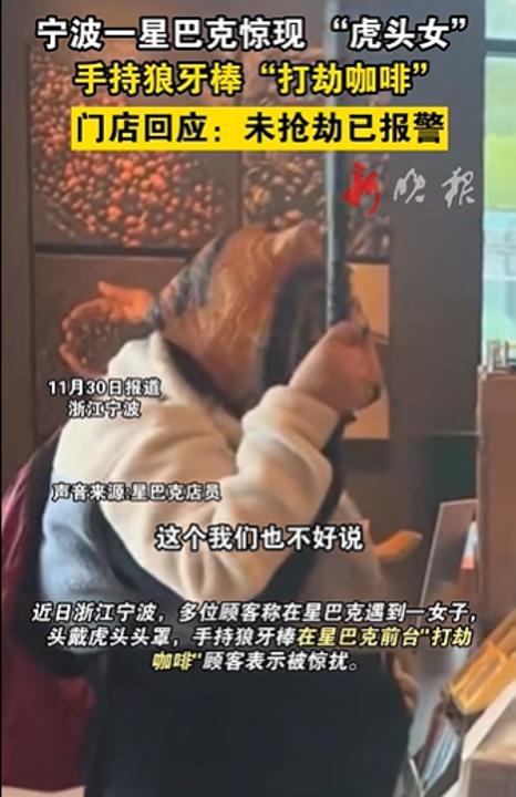 11月27日,多位顾客称在星巴克(宁波象山一兆韦德广场店)遇到一名女子身背红色背包,头戴虎头头罩,手持一根狼牙棒,在星巴克前台挥舞狼牙棒“打劫咖啡”。有顾客称被吓到。