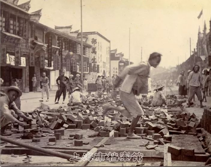 ▲ 1903年,工人们在南京路上铺路。(上海市档案馆藏)