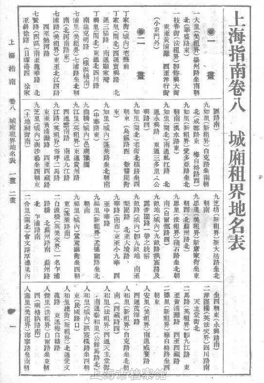 ▲ 1930年出版的《上海指南·城厢租界地名表》。当时上海的道路仍有不少以“街”“衖(弄)”为通名的,如“一枝春街”“丁家衖”。(上海市档案馆藏)