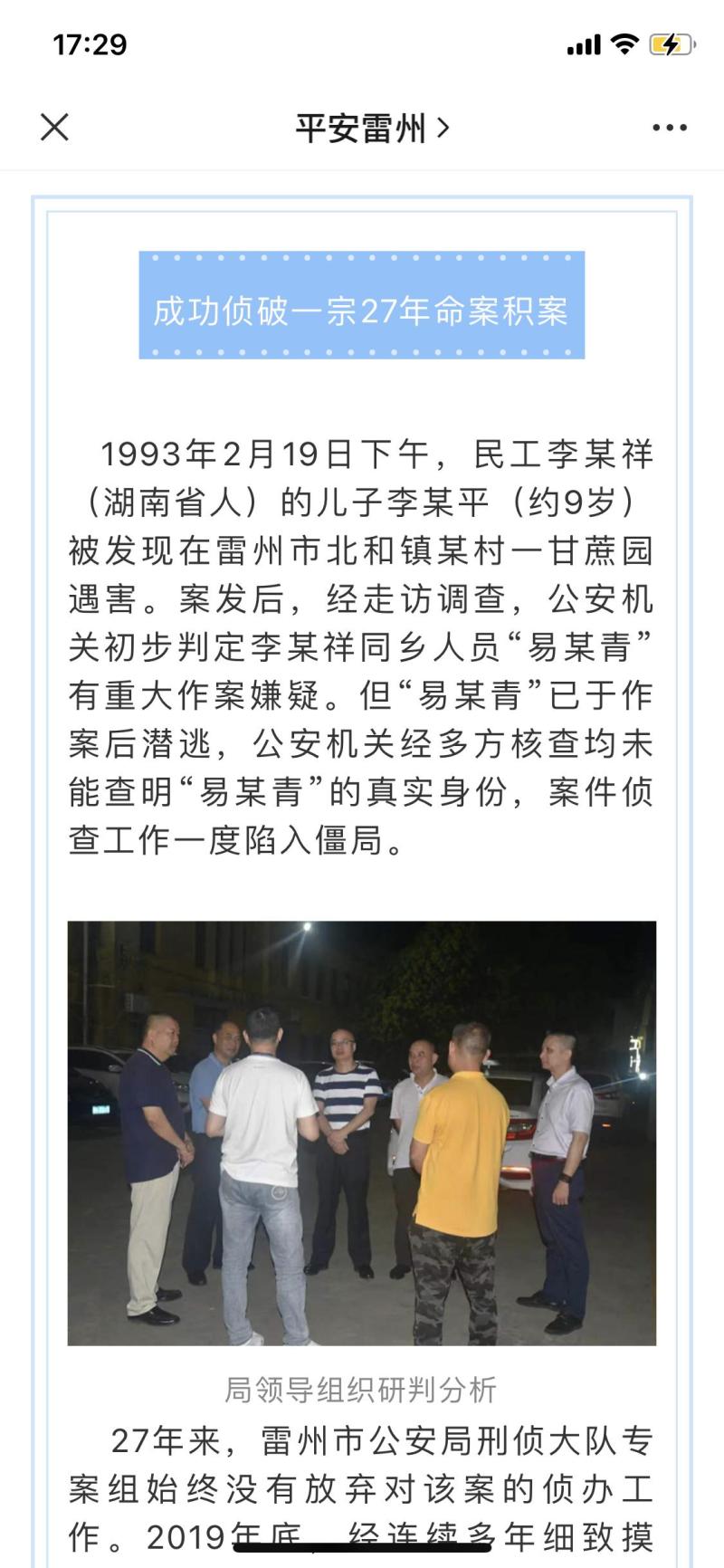 2020年6月5日,雷州市公安局通过官方微信公众号“平安雷州”发布消息称,该局“成功侦破一宗27年命案积案”。
