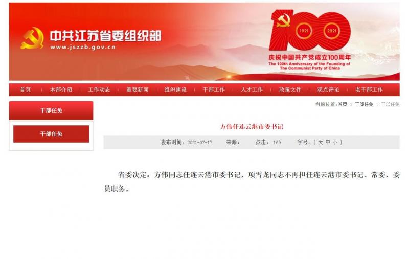 中共江苏省委决定:方伟同志任连云港市委书记,项雪龙同志不再担任连云港市委书记、常委、委员职务。