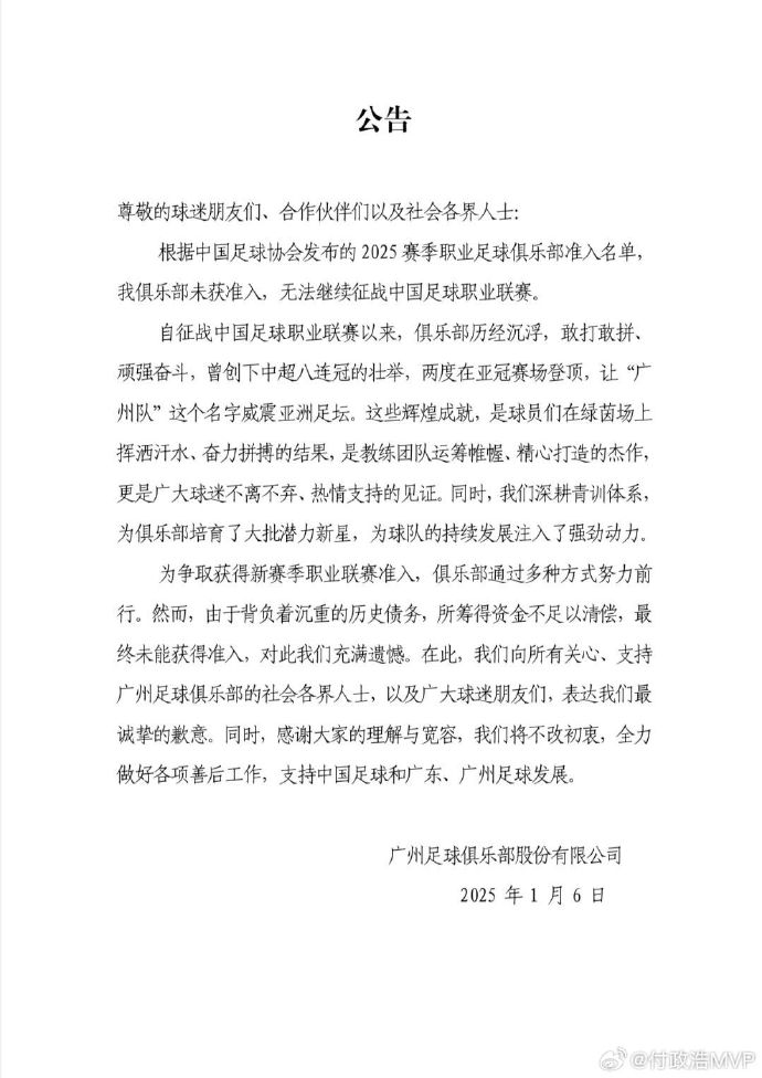 2025年年初,广州队基本宣告解散。这个公告都没有盖章、八连冠也是明显事实差错。