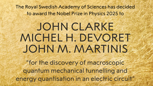 今年物理学奖授予约翰·克拉克、米歇尔·H·德沃雷、约翰·M·马丁尼斯,以表彰他们发现电路中的宏观量子力学隧穿效应和能量量子化