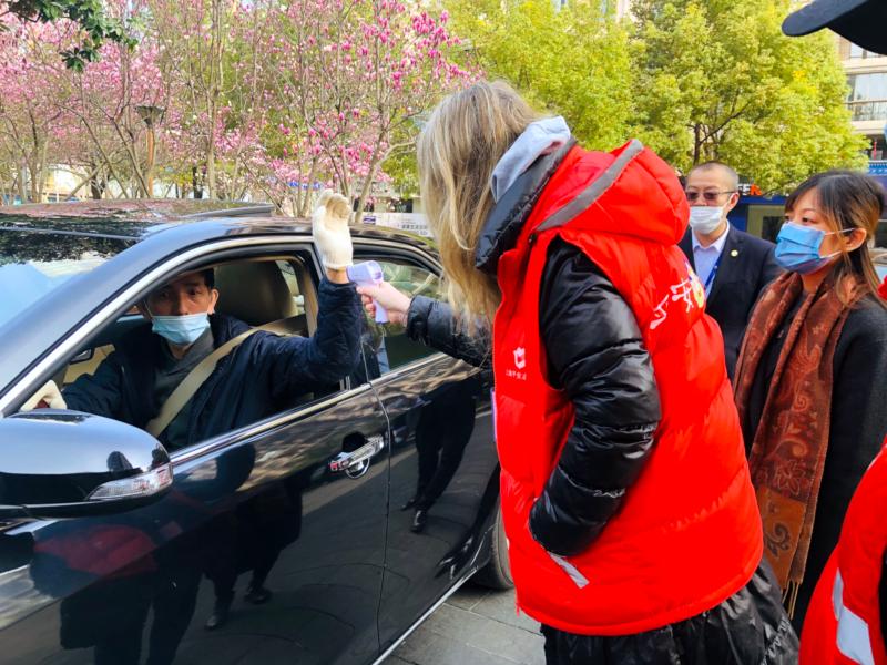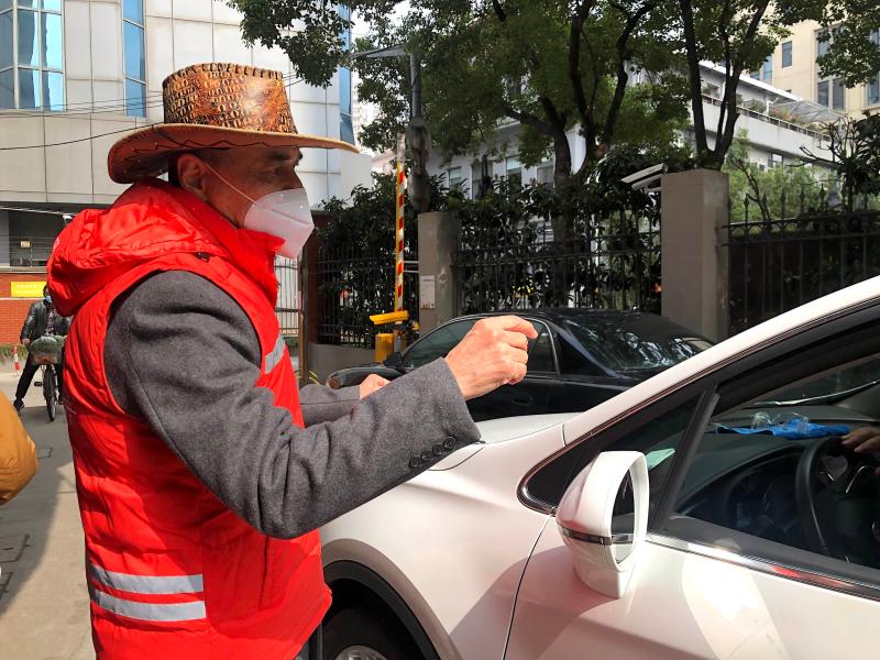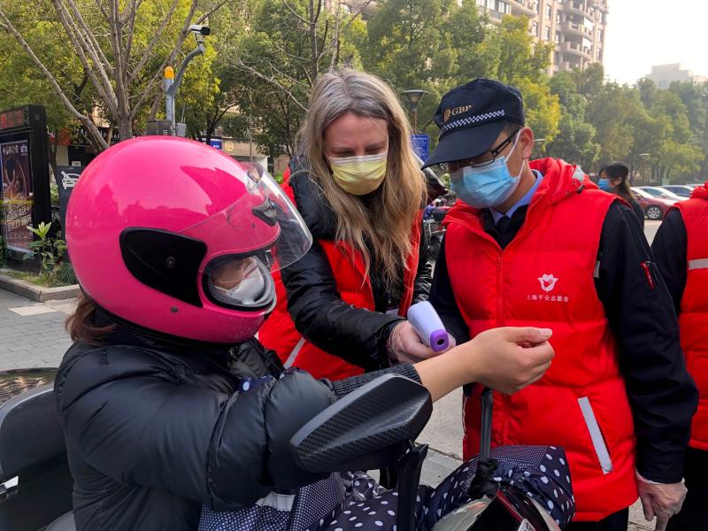 3月11日早上9时不到,家住古北国际花园的意大利居民安吉拉·布鲁西诺就来到小区门口,穿上保安递来的“平安志愿者”马甲,开始学习测温枪的使用方法。这是安吉拉担任小区门岗志愿者的第一天。此前,她还为居民区翻译过意大利语版本的防疫宣传。
