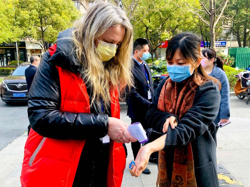 记者在古北国际花园小区门口见到安吉拉(Angela Brussino)时,她刚穿戴好志愿者马甲,练习测量手腕温度。“测量的时候靠近一些手腕。”“好的,我明白啦。”听到保安的指导,安吉拉马上用简单的中文回复,语调中带着些跃跃欲试。