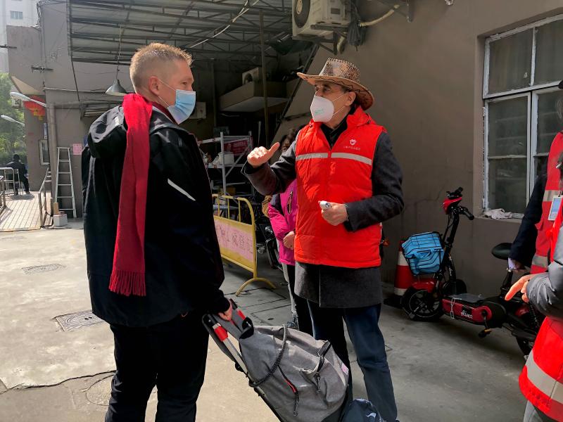几句你来我往中,两个金发碧眼的“老外”就这么在上海的小区大门口“唠嗑”了起来。一旁的居委书记朱燕彬和主任何玲金以为发生了问题,上前一看才发现,白马克已经熟练地为这位丹麦居民测量了体温、检查了“随申码”,还切换“英文频道”叮嘱对方,“以后进小区,要主动把出入证给穿马甲的志愿者看。”