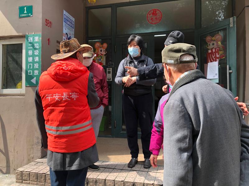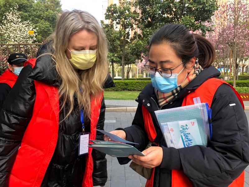 居民区书记盛弘(右)为安吉拉介绍最新的防疫措施