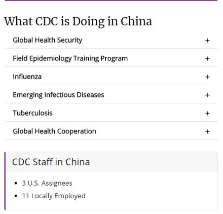 根据美国疾控中心官网显示,目前该机构在华人员共14人,其中3名美国派驻人员,11名为(中国)当地雇员。