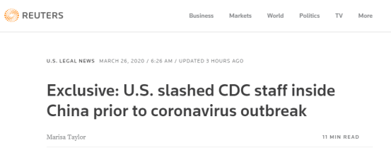 “新冠病毒疫情暴发之前,美国削减疾控中心在华人员”,路透社26日以此为题发布一则独家报道称,在过去两年时间内,美国疾病控制与预防中心(CDC)将其在华办公室职员从47人削减至14人,“砍掉”了超过2/3的在华人员。