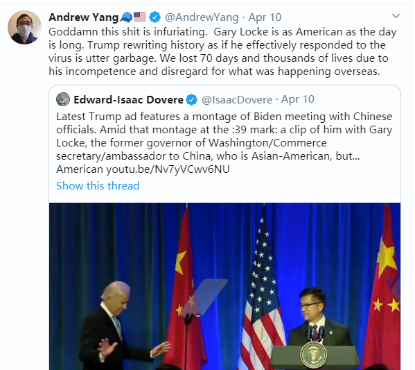 就连之前曾表示亚裔美国人应该更多效忠美国,才能避免在新冠肺炎疫情中遭到歧视的美国总统前华裔参选人杨安泽,都认为特朗普的这段将骆家辉描述成是中国官员的竞选广告令人“极为愤怒”。