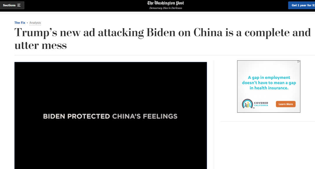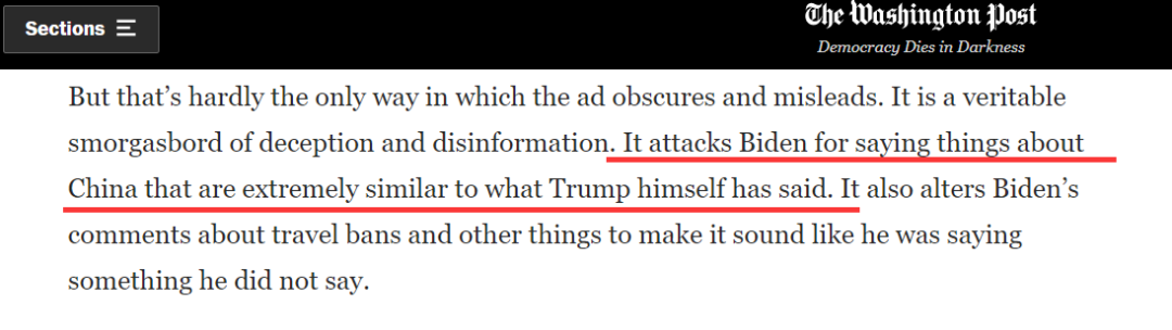 对此,《华盛顿邮报》认为,这是特朗普的竞选团队在通过画面语言,展现拜登在向一个站在中国国旗面前,有着亚裔面孔的人低头,以此进一步证明他对中国的“恭敬”。