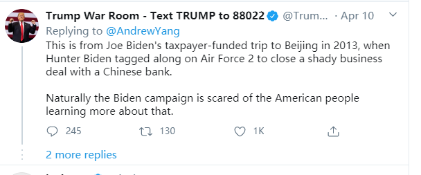 有特朗普的支持者还称,这段画面是拜登在2013年时花着美国纳税人的钱去访华时的场景,当时他与中国的银行签订了很多不想让美国人知道的协议。